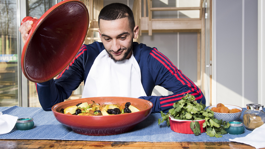 Ajax bracht in het voorjaar van 2018 het officiële Ajax-kookboek 'Koken met 3 Sterren' uit. Diverse spelers, trainers en Ajax-prominenten gaven niet alleen hun favoriete gerecht prijs, ze legden ook uit hoe die te bereiden. In deze aflevering dus de Marokkaanse tajine van moeder Ziyech, met de toelichting van Hakim.