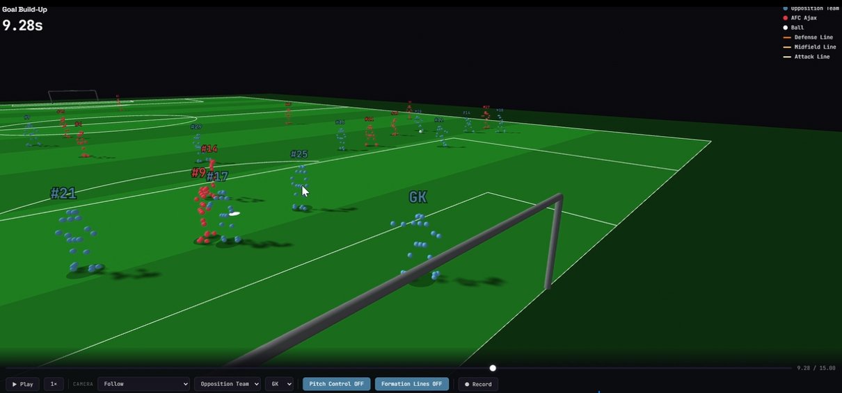 Tijdens de hackathon kregen deelnemers toegang tot geavanceerde 3D limb tracking data van een Eredivisiewedstrijd. Deze technologie registreert tientallen punten op het lichaam van spelers, waardoor analisten niet alleen zien waar spelers staan, maar ook hoe ze bewegen en waar ze hun aandacht op richten.