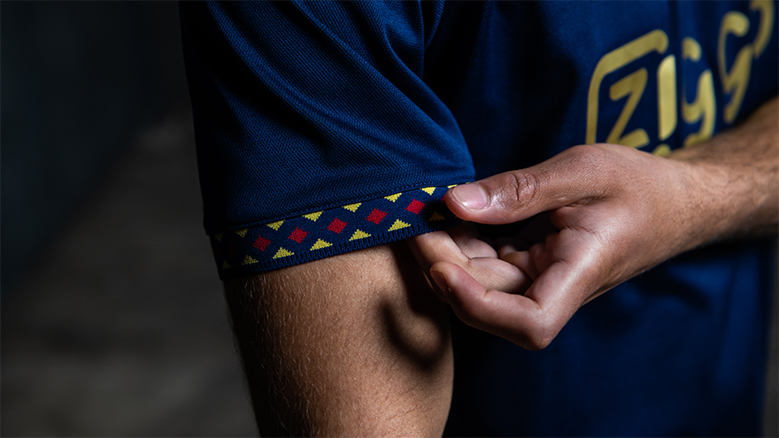 Het clublogo, de verschillende sponsorlogo’s en de rugbedrukking zijn goud. Rood komt terug in de drie kampioenssterren op de borst en de adidas-strepen op de schouders. In het oog springende details zijn verder de opvallende geweven kraag en mouwboorden, waarbij door plaatsing van aaneengesloten kruizen en gebruik van de accentkleuren van het shirt een speels grafisch patroon ontstaat.