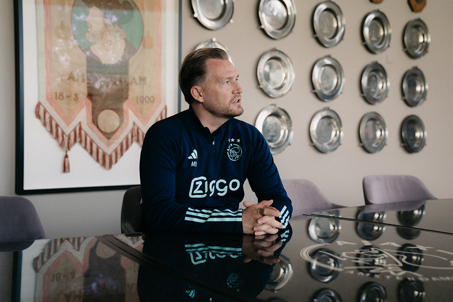 Achter hem op het bord staan de woorden: 'Ik leer het je zelf te doen'. "Menno Geelen deelde deze quote onlangs. Ik denk dat deze zeer toepasselijk is voor hoe wij naar ontwikkelen kijken", zegt Beuker terwijl hij zich weer terugdraait naar de tafel. "Dit past goed bij de manier hoe we zaken op het gebied van spelintelligentie aan gaan scherpen in de middenbouw", zegt Beuker over de tweede belangrijke eigenschap van een Ajax-speler. "Het Ajax-voetbal draait om spelers die alle voetbalgedragingen leren herkennen. En meester te zijn over tijd en ruimte, maar daarin wel zelf oplossingen vinden. Spelers moeten technisch en inzichtelijk sterk zijn in ieder scenario. Onze rol is daarin zoals vroeger meer begeleidend, in plaats van voorzeggend."