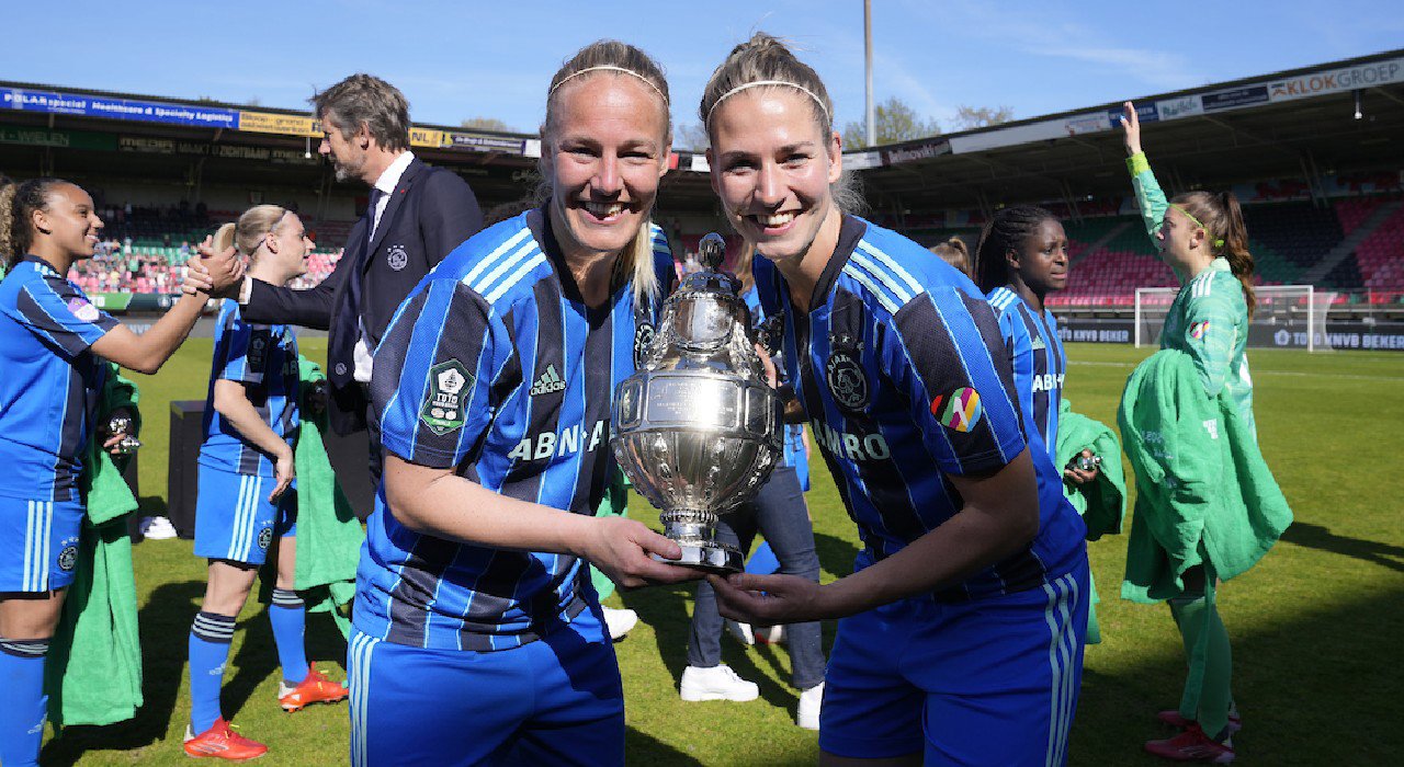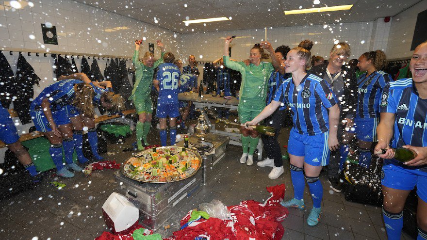 Na afloop van de gewonnen bekerfinale tegen PSV (1-2) barstte er een groot feest los in de kleedkamer van de Ajax Vrouwen. Danny Schenkel is enorm trots op zijn ploeg en werd 'beloond' met een koude douche. Gelukkig had de trainer van de Ajax Vrouwen zich goed voorbereid.