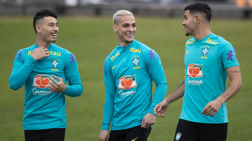 Lachende gezichten bij onder andere Antony op de training van het Braziliaanse elftal.