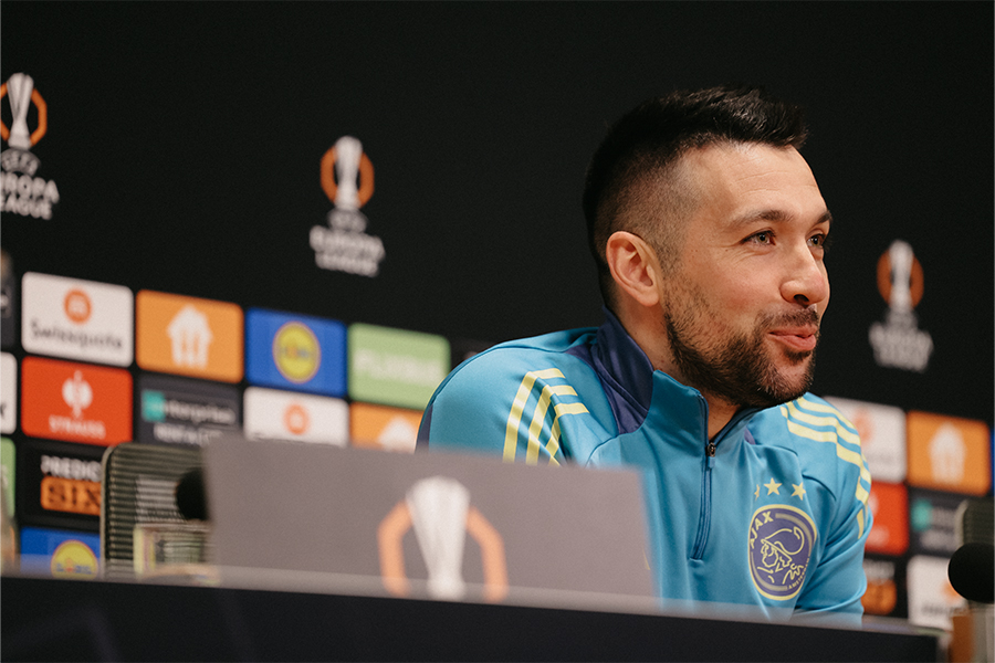 De trainer schoof woensdagmiddag aan in de perszaal van de Johan Cruijff ArenA samen met Mika Godts. Samen blikten ze vooruit op de wedstrijd tegen de Duitse nummer drie in de UEFA Europa League en keken ze terug op de goede resultaten van de afgelopen weken. Zo is Ajax nu negen duels op een rij ongeslagen in de Eredivisie.