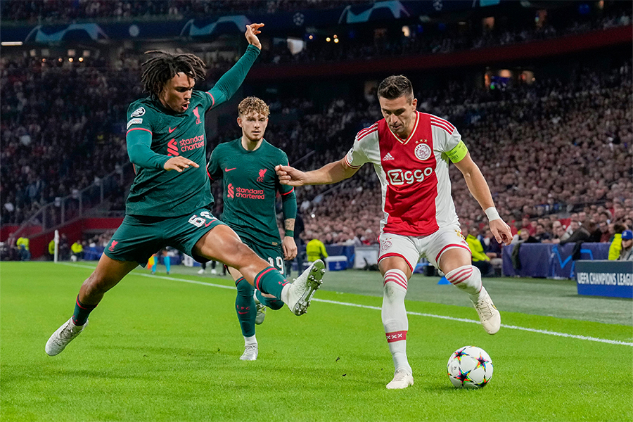 Hoewel de wedstrijd steeds meer in balans kwam, was het toch weer Ajax dat een aardige mogelijkheid kreeg. Met vier aanvallers tegen twee verdedigers trokken de Amsterdammers richting Becker; Brobbey gaf voor vanaf rechts waar Tadic een kon afdrukken. Hij schoot echter tegen Alexander-Arnold aan.
