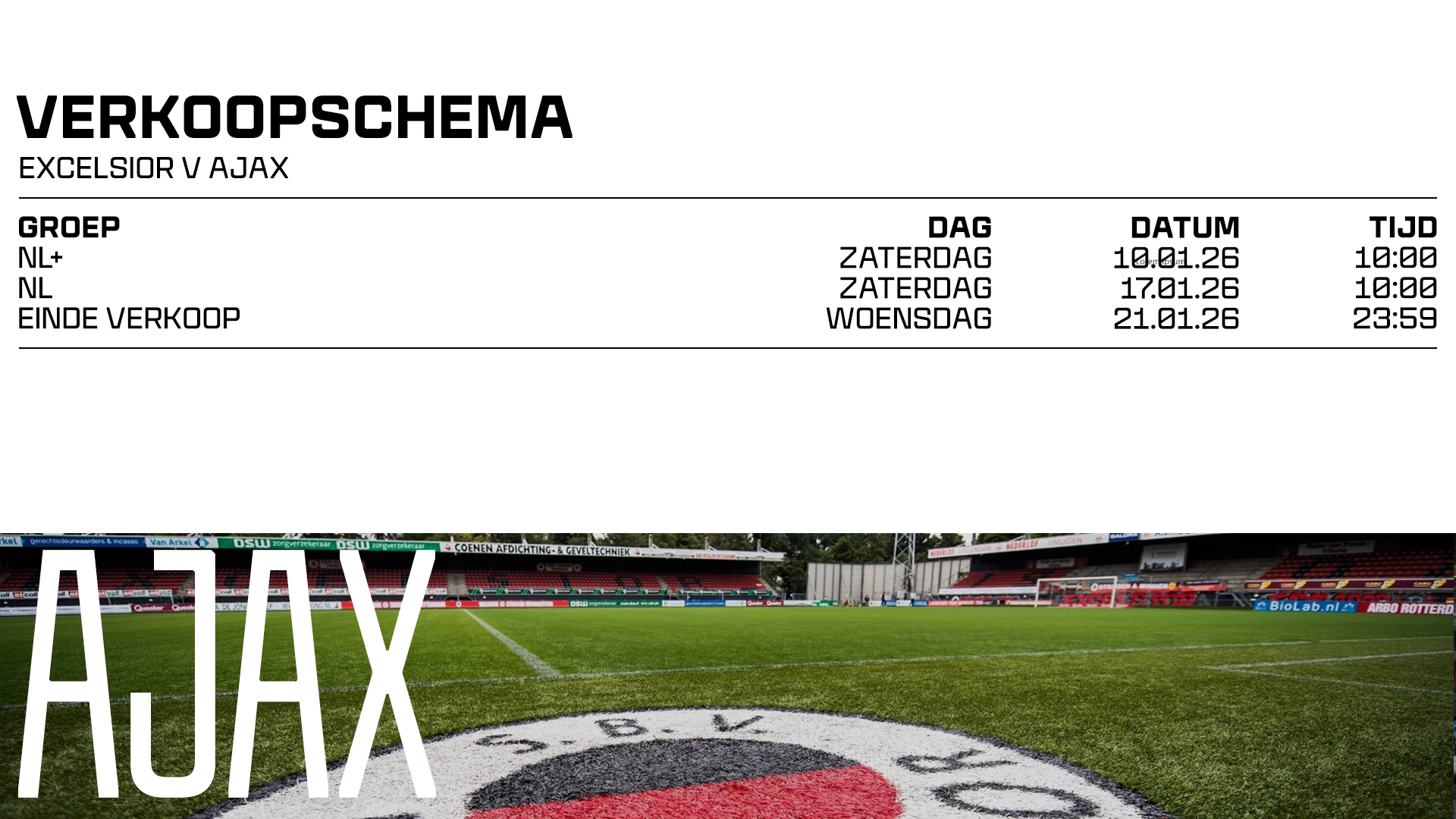Op 1 februari 12:15 uur speelt Ajax een uitwedstrijd tegen Excelsior in Rotterdam. Voor het uitvak zijn 400 kaarten beschikbaar, inclusief buscombi.