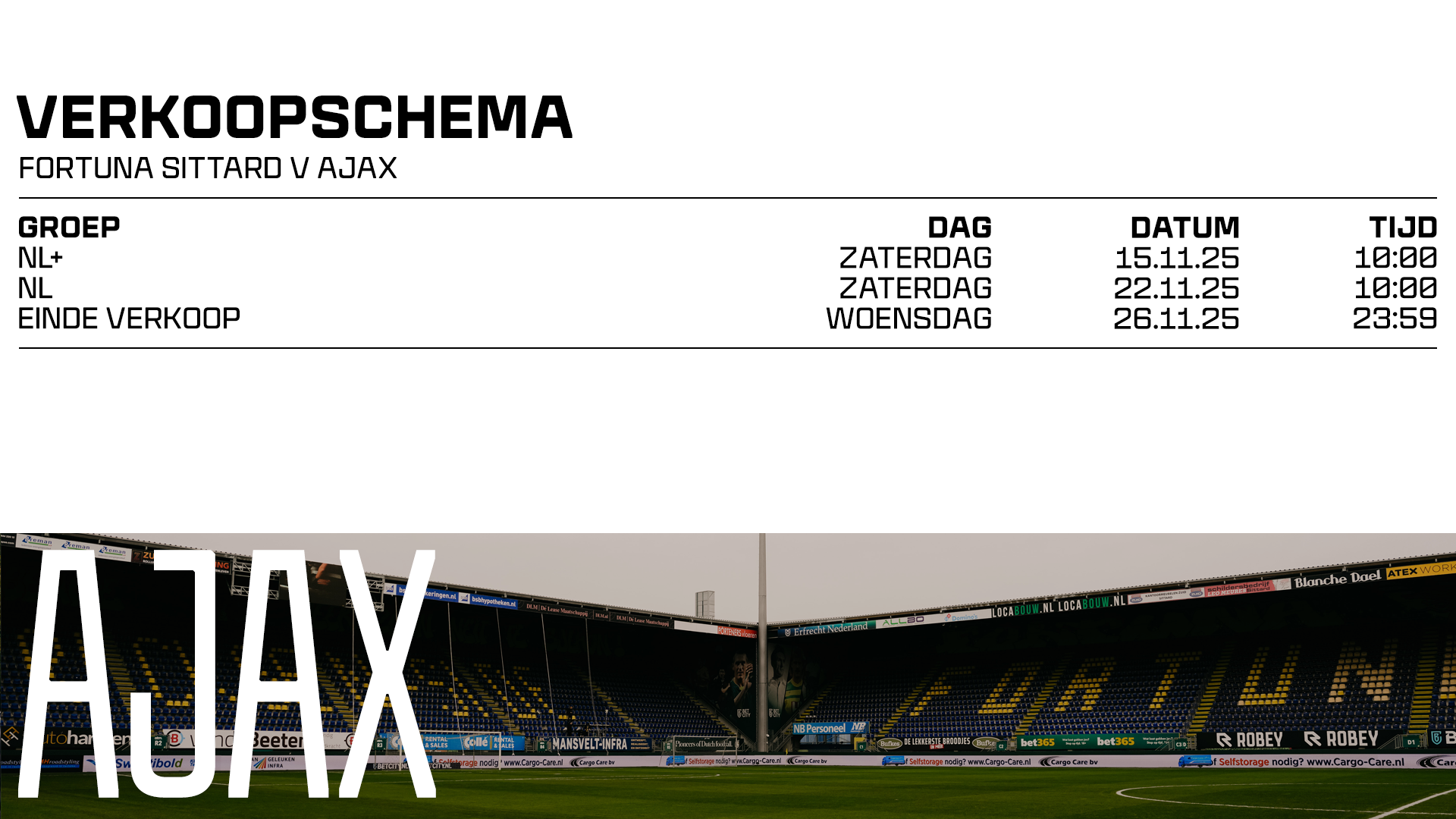 Zaterdag 6 december 18:45 uur speelt Ajax de uitwedstrijd tegen Fortuna Sittard. Alle kaarten voor het uitvak zijn uitverkocht.