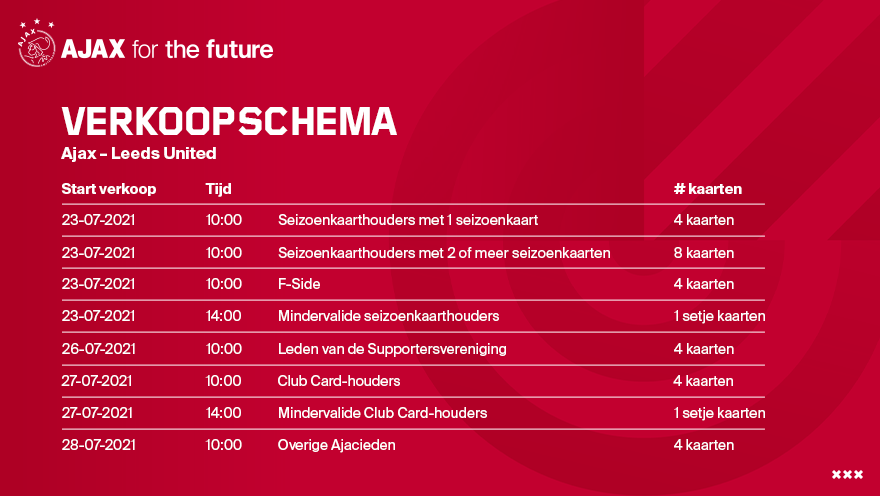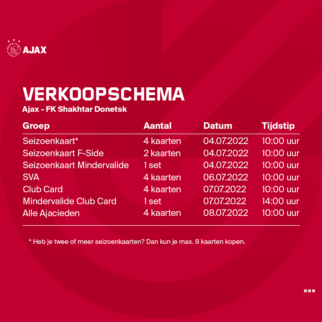 Via Ajaxlife.nl kan jij je aanmelden voor een lidmaatschap bij de Supportersvereniging Ajax. Hiermee ben je na de seizoenkaarthouders en voor Club Card houders aan de beurt om kaarten te bestellen voor alle thuisduels.