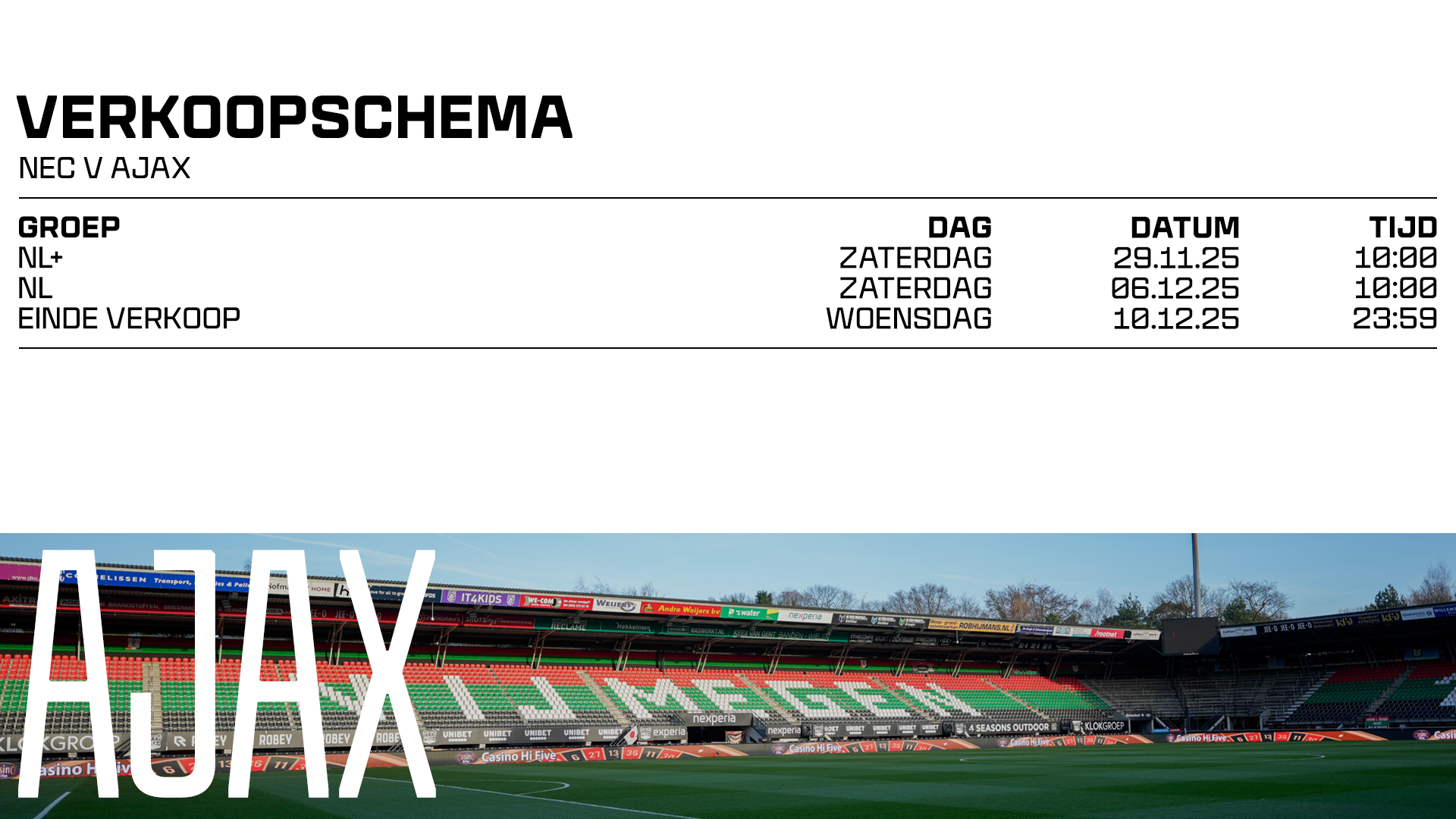 Kaart gekocht? Meer informatie over het wedstrijdbezoek volgt per mail op 18 december. Niks missen rondom uitduels? Zet de pushmeldingen aan voor de Ajax app of volg @ajaxfancare via X en Instagram.
