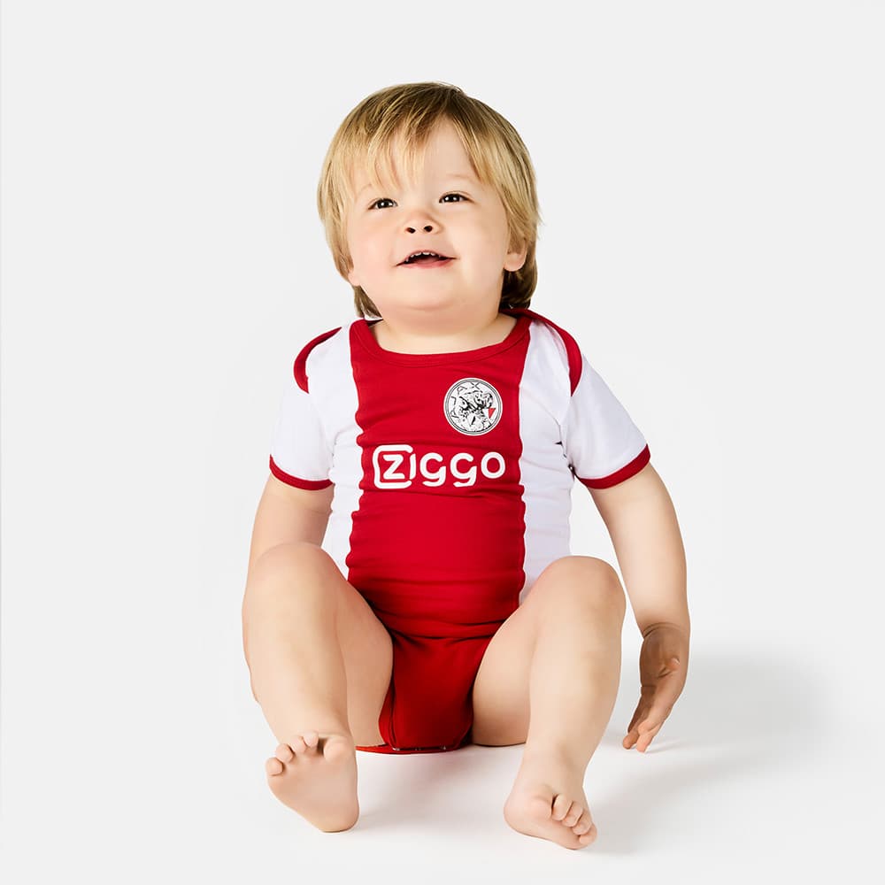 Ajax romper met korte mouw in de bekende Ajax kleuren. Op de romper staat het logo van Ajax en van de sponsor. Dit Ajax rompertje heeft een envelop opening: onderkant is voorzien van drukknoopjes. Met dit Ajax rompertje ziet de baby er direct uit als een Ajax supporter uit!