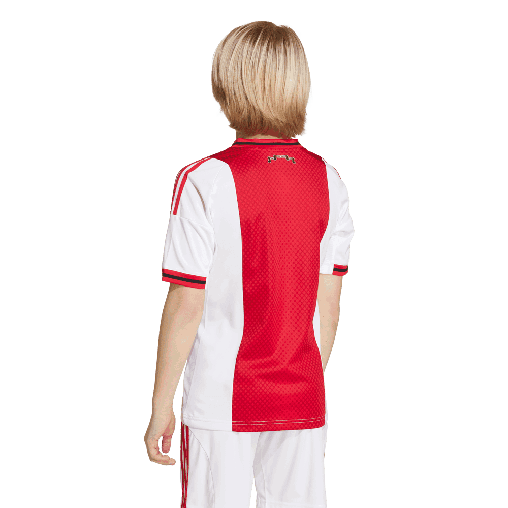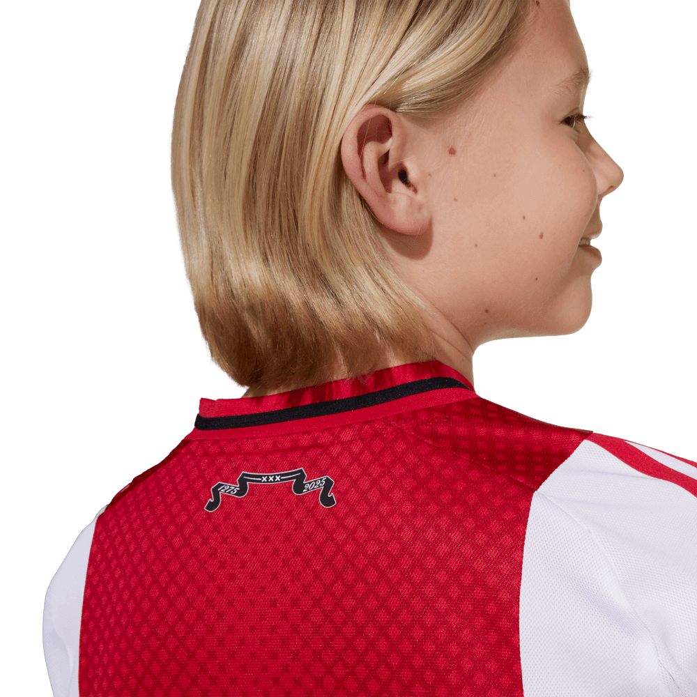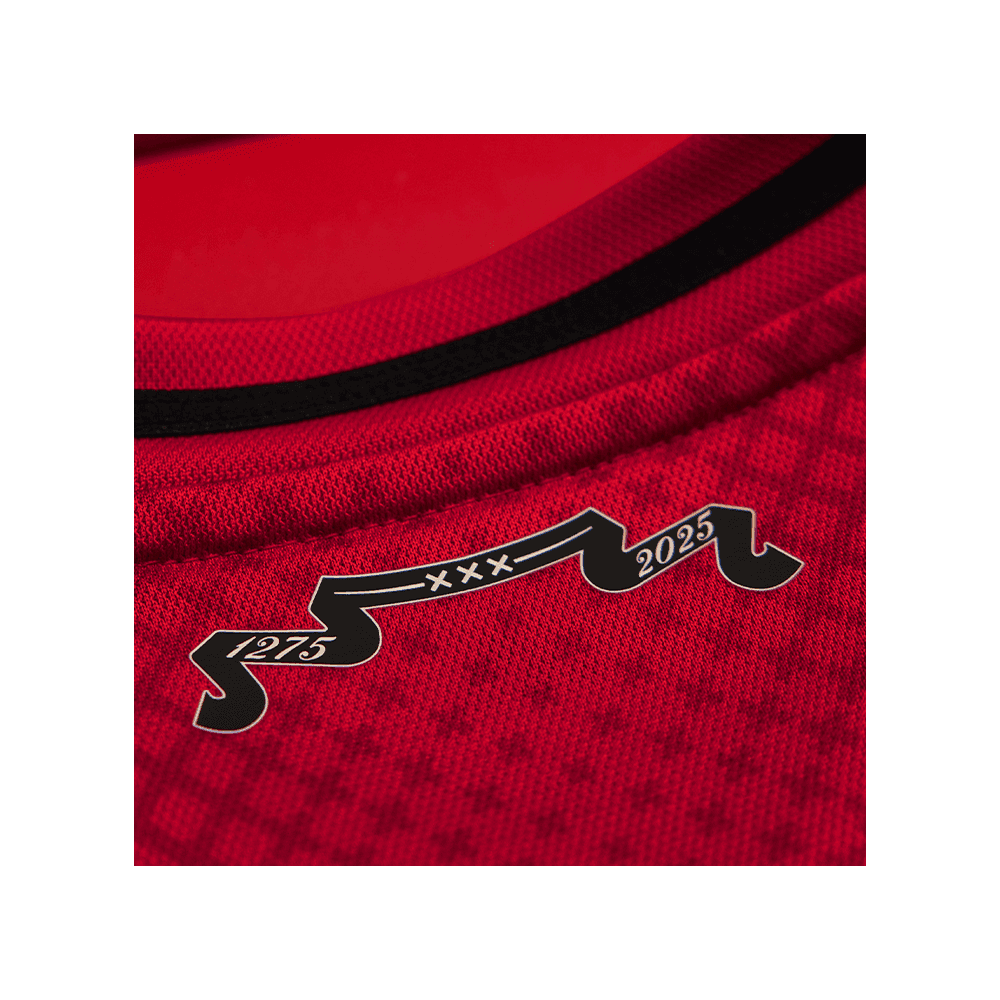 Ons nieuwe thuistenue voor seizoen 25/26. Het shirtontwerp is, zoals altijd, wit-rood-wit en brengt het klassieke logo terug op de borst. In de rode baan is een subtiel patroon van rode kruizen verwerkt, en op de rug prijkt een klein vaandel – een eerbetoon aan 750 jaar Amsterdam.