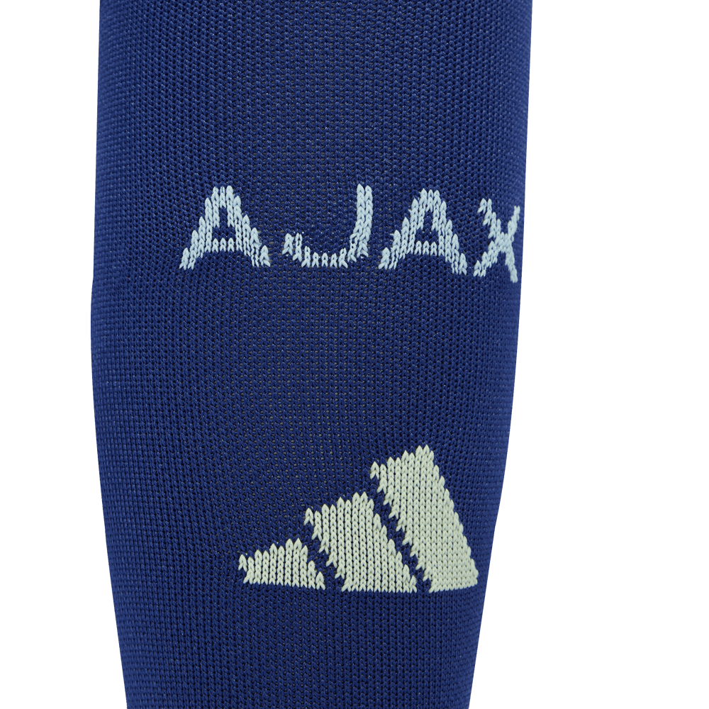 De Ajax Uitsokken 25/26 zijn donkerblauw gekleurd en bevatten geelgroene en lichtblauwe elementen.